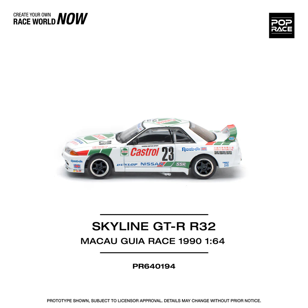 Pop Race 1:64 Nissan R32 Skyline GTR — Ganador de Macao 1990 #23 Castrol